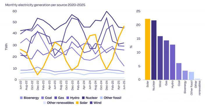 En su último informe, "Perspectivas del Mercado de la Energía Solar en la UE: Análisis de Mitad de Año 2025", SolarPower Europe (SPE) señala que, si bien la energía solar se convertirá en la mayor fuente de electricidad de la UE por primera vez en junio de 2025, representando el 22,1 % de la generación total de energía, el aumento anual de las instalaciones solares experimentará su primer descenso en 10 años. La estimación neutral para las nuevas instalaciones en 2025 es de 64,2 GW, lo que supone un descenso interanual del 1,4 %.