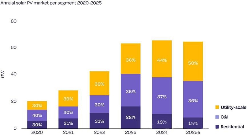 La eliminación progresiva de los subsidios para proyectos de energía residencial en muchos países ha provocado una desaceleración del crecimiento, convirtiendo a las centrales eléctricas terrestres en el pilar principal.